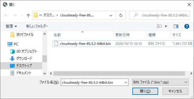 ・先程ダウンロードしたcloudready-free-85.3.2-64bit.binを選択します。