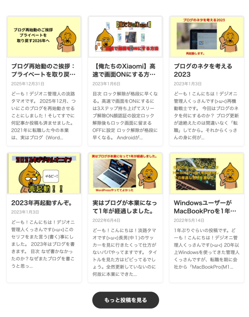 - トップページ用: 最新6〜8件(3〜4列×1〜2段)+「もっと見る」ボタン