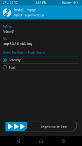 1で保存した最新のTWRPのイメージファイルを選択しRecoveryにチェックし「Swip Confirm Flash」を右にスライドする。