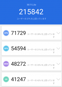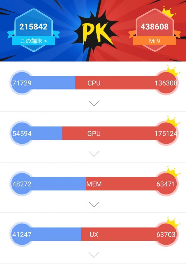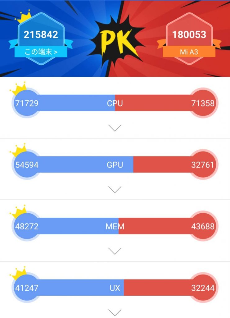 さすがにフラッグシップ機「Mi9」と比較すると半分以下です。「Mi A3」と比較すると25,000点程上回ってますね。