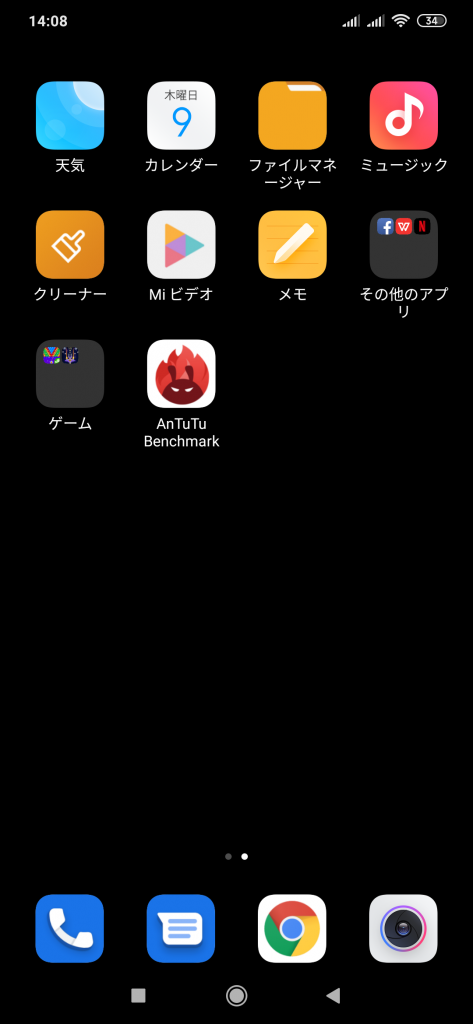 せっかく有機ELなのでダークモードでテーマもブラックをメインに設定。初期アプリや配置はこんな感じ。ベンチマークの測定の為antutuだけインストールしています。